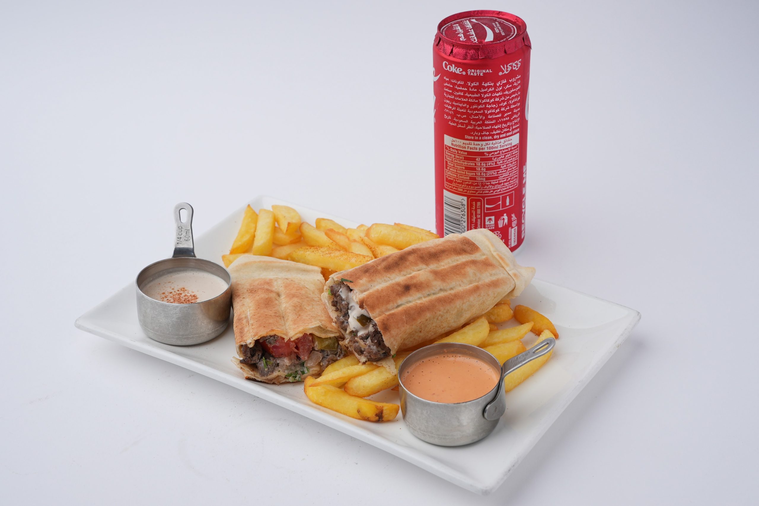 شرائح لحم، طحينة، مخلل، بقدونس، طماطم