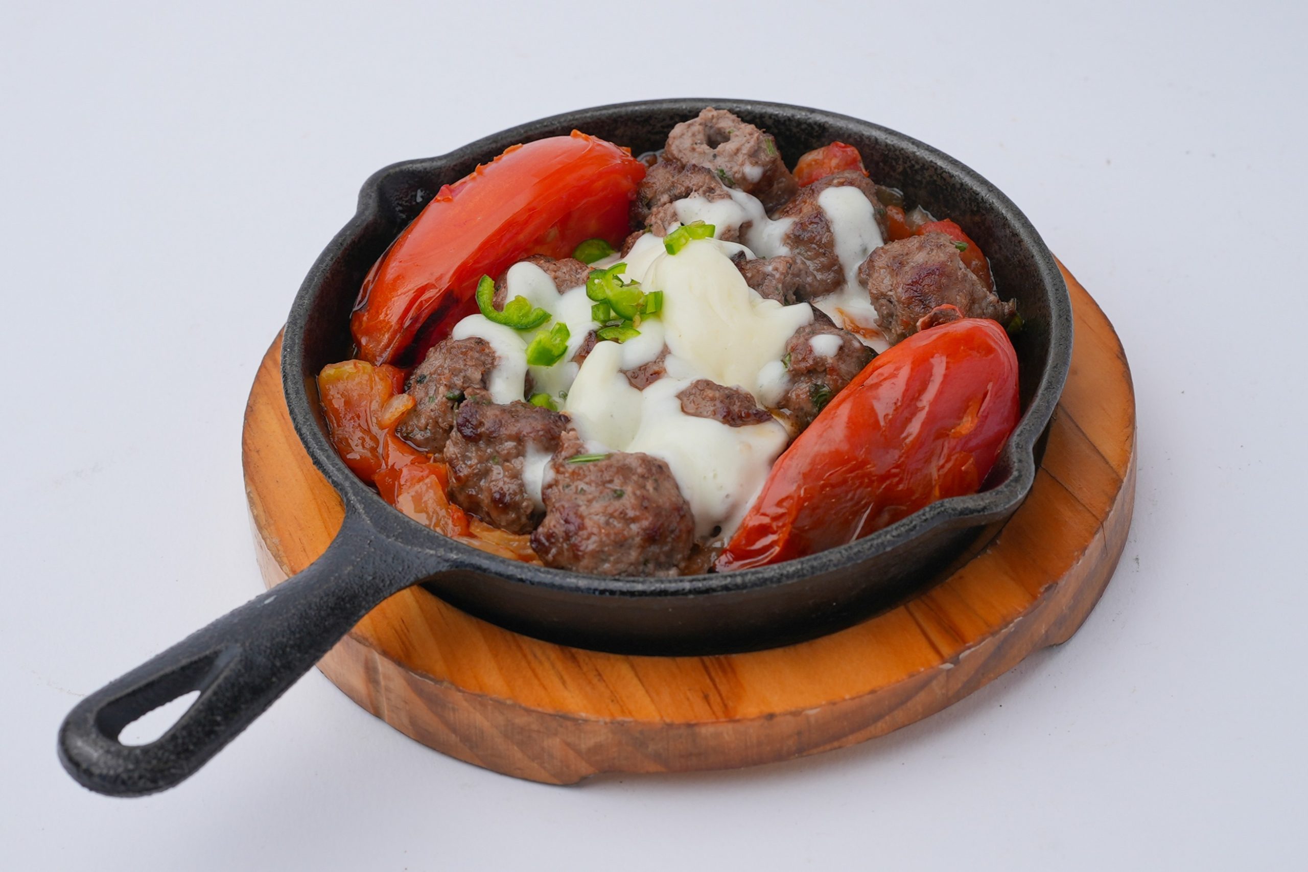 كباب لحم حراق على الطريقة الأرمنية مشوي على الفحم الطبيعي مع الطماطم المشوية وجبن الموزريلا الذائب مع صوص الطماطم والبصل اللذي يضيف نكهة مميزة ( حراق )