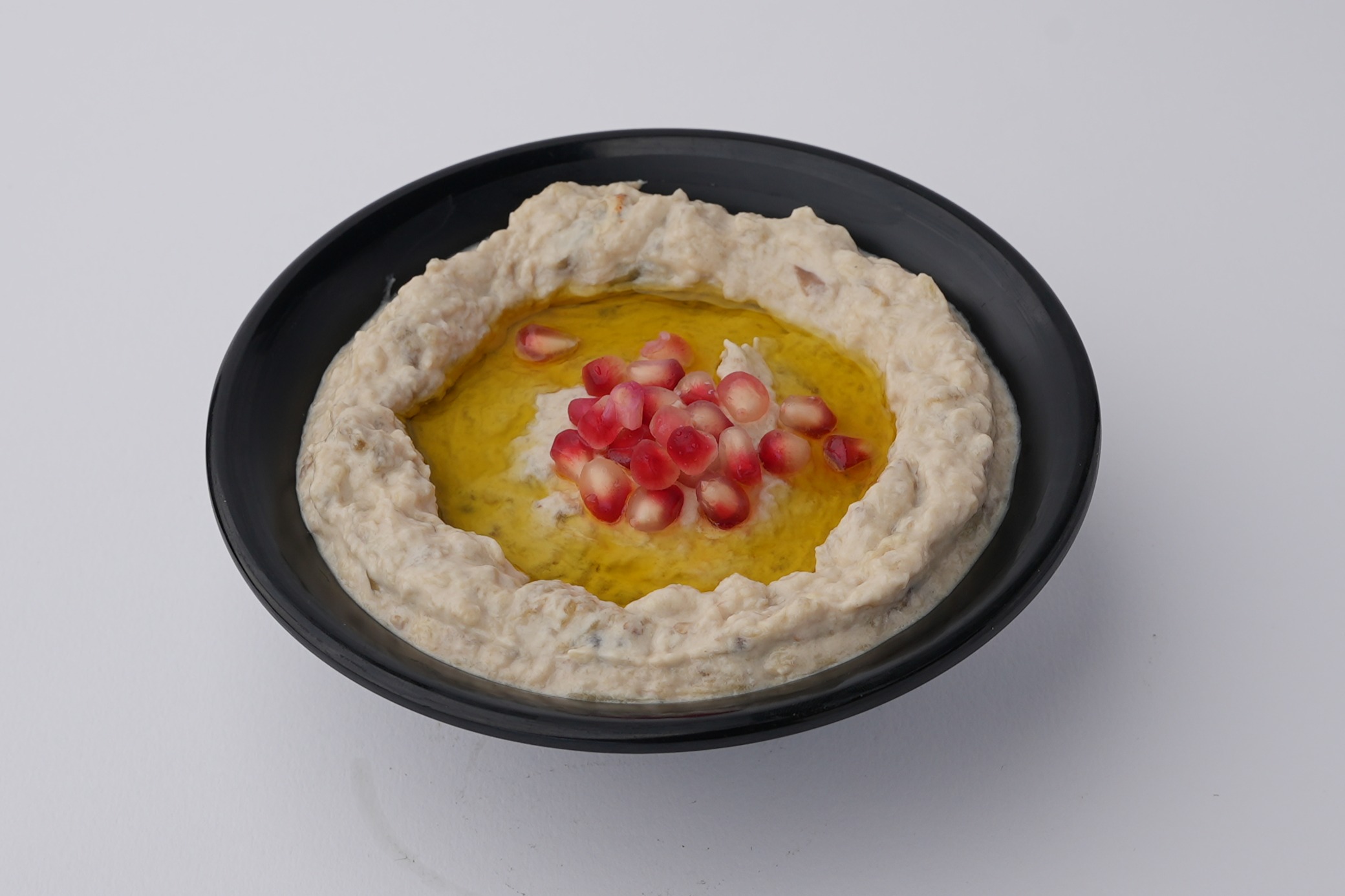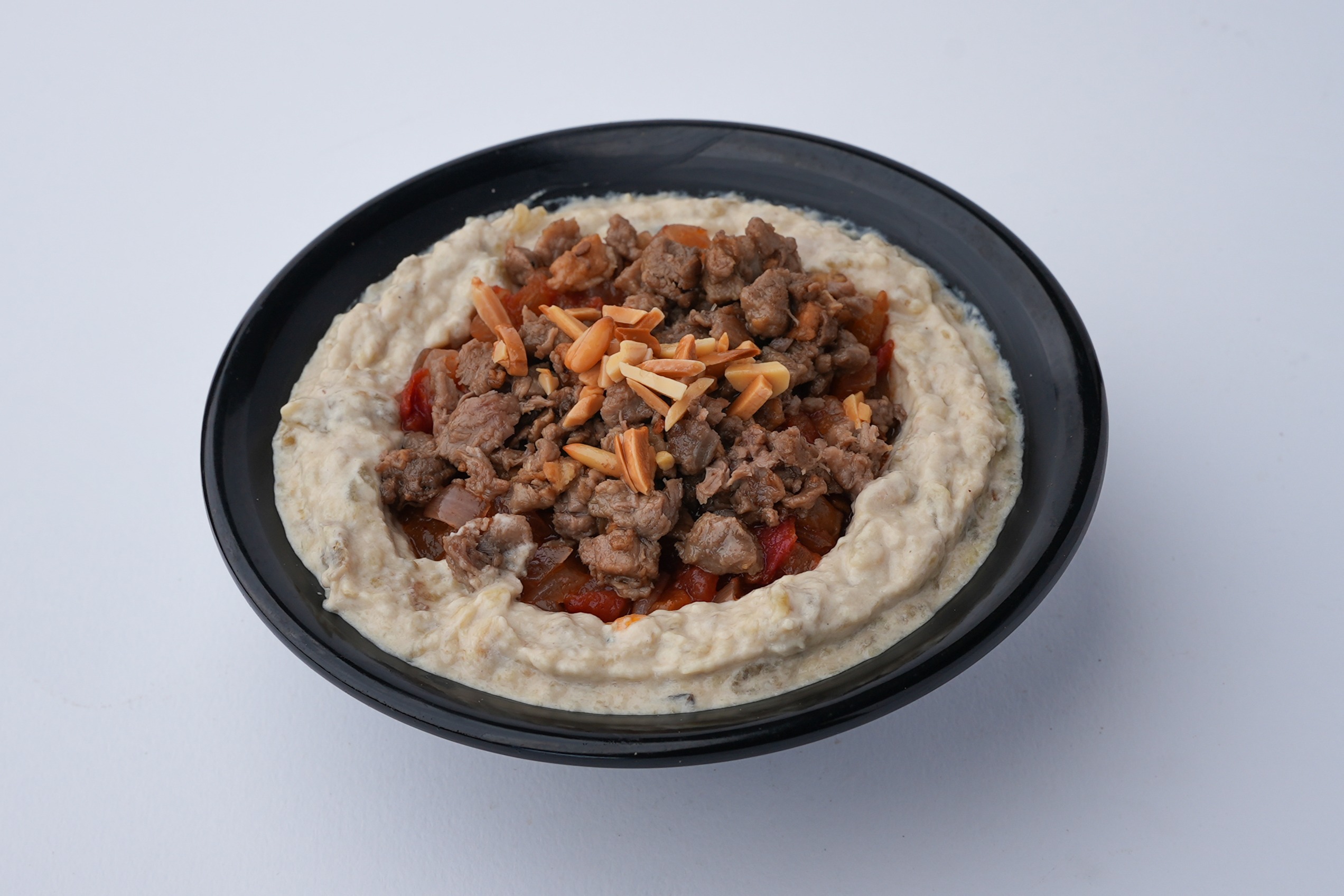 متبل باذنجان مشوي على الفحم الطبيعي مع الطماطم والبصل ولحم القاورما اللبناني