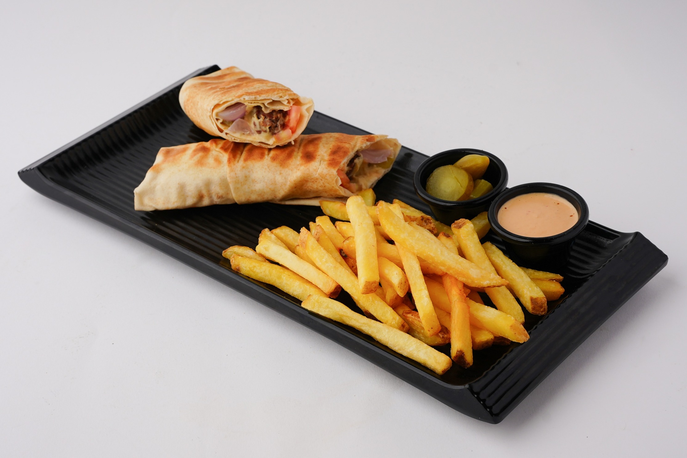 شرائح لحم، طحينة، مخلل، بقدونس، طماطم