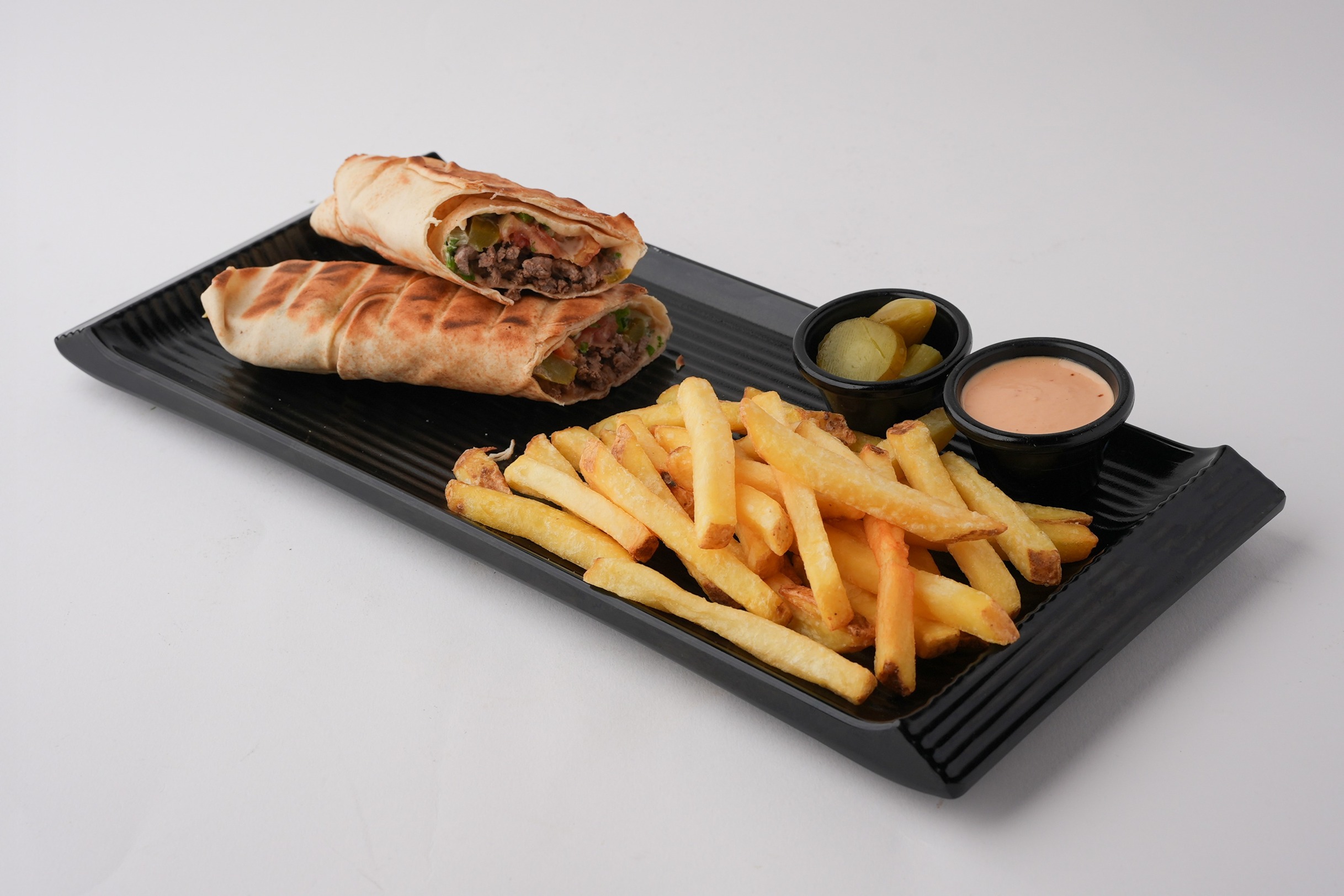 لحم بلاك انجوس، سلطة ملفوف، بطاطس، كاتشب